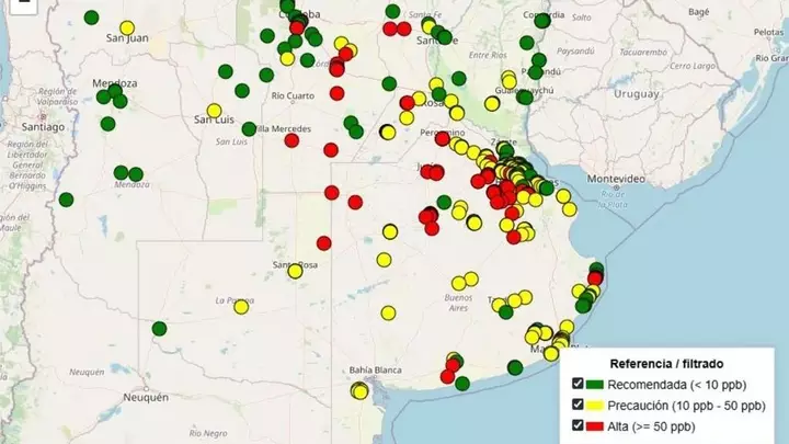 La situación también alcanza al conurbano bonaerense. En distritos como Vicente López (117 ppb), Almirante Brown (56), Ezeiza (96) y San Vicente (163) se detectaron niveles que superan los límites recomendados. No obstante, los estudios aclaran que dentro de un mismo partido pueden existir pozos con agua apta para el consumo y otros con valores críticos, como sucede en Villarino o el Partido de la Costa.