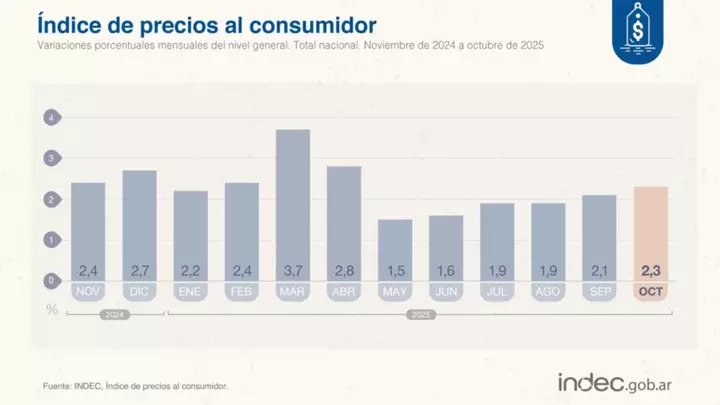 El Instituto Nacional de Estadística y Censos (INDEC) publicó este miércoles que la inflación del mes de octubre en Argentina fue del 2,3 %. De esta forma, los precios registraron un leve repunte respecto de septiembre, cuando el aumento mensual había sido del 2,1 %.