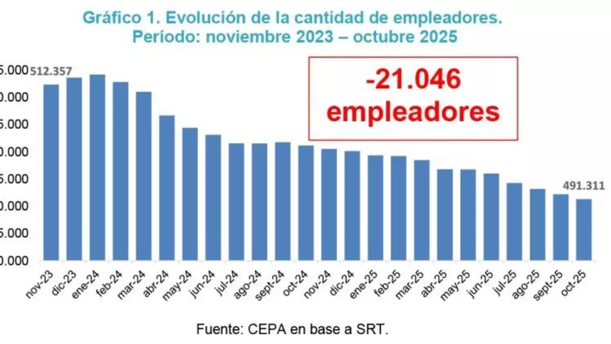Un informe del Centro de Economía Política Argentina (CEPA) revela un marcado retroceso del empleo formal y del entramado empresarial durante los primeros 23 meses del gobierno de Javier Milei. Según datos de la Superintendencia de Riesgos del Trabajo (SRT), entre noviembre de 2023 y octubre de 2025 se perdieron 21.046 empleadores con trabajadores registrados y 272.607 puestos de trabajo formales en unidades productivas.