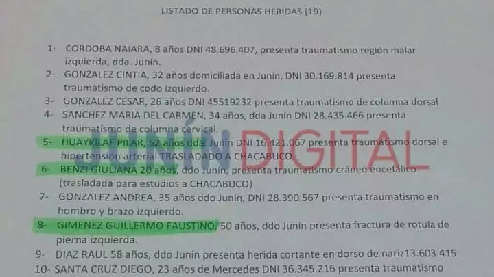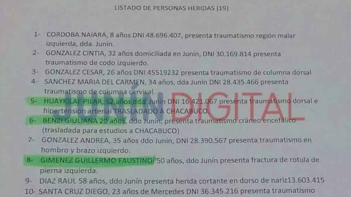 JUNÍN DIGITAL accedió en exclusiva a la nómina de juninenses accidentados tras el choque entre dos trenes que ocurrió en la mañana de este jueves cerca de Rawson.