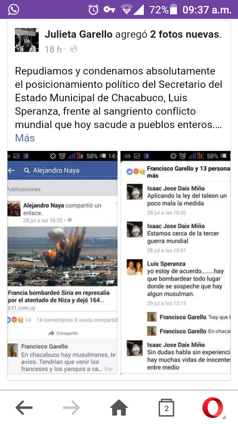 JUNINDIGITAL estuvo buscando en la medianoche de este jueves el mensaje escrito por el ex funcionario municipal chacabuquense de Cambiemos pero aparentemente ya había sido borrado por su autor aunque continuaban comentarios de repudios en el mismo muro en que fue Speranza publicó su posteo el cual pudo ser guardado por otros chacabuquenses que también expresaron su repudio por las redes sociales.
