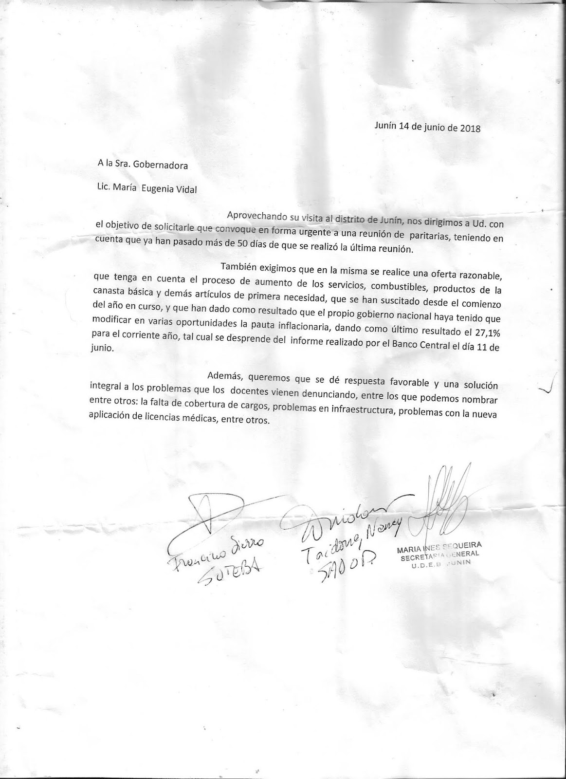 Aprovechando su visita al distrito de Junín, nos dirigimos a Ud. con el objetivo de solicitarle que convoque de forma urgente a una reunión de paritarias, teniendo en cuenta que ya han pasado más de 50 días de que se realizó la última reunión.