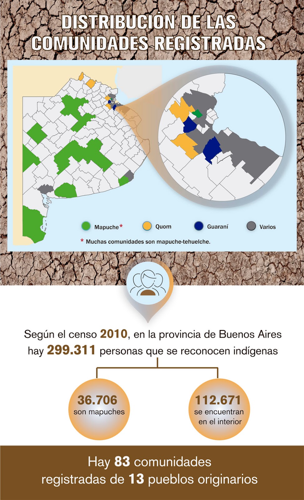 Un total de 83 comunidades de 13 pueblos indígenas fueron registradas por el Estado en los últimos años en la provincia de Buenos Aires, según un mapeo que lleva adelante el Consejo de Asuntos Indígenas (CPAI) desde 2016. En el mismo territorio, se extienden diversos conflictos por tierras.