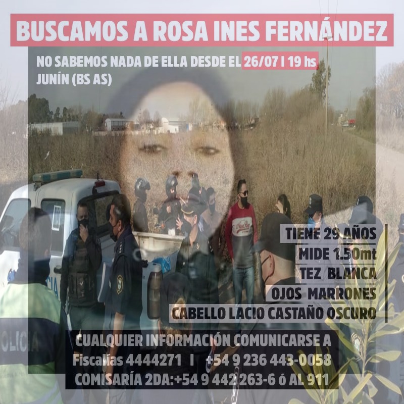 Este sábado prosiguió la búsqueda puerta a puerta de Rosa Inés Fernández, la jovende 29 años y madre de cuatro hijos que está desaparecida desde el pasado domingo a la tarde. El fiscal Esteban Pedernera interviene en el caso caratulado "Averiguación de paradero" y en ese marco se realiza el rastrillaje minucioso, la búsqueda puerta a puerta, la entrevista a vecinos y la recepción de testimonios de familiares y allegados.