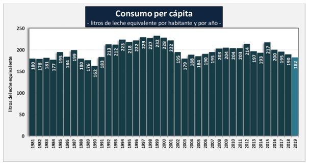 Según los datos de la Dirección Nacional Láctea, el año 2019 cerró en 10.343 millones de litros, lo que representa una caída del 14% de la producción primaria en comparación con el año 2015 y una caída del 2% respecto al año inmediatamente anterior. Es un valor similar al que cerró la producción primaria en el año 2010 (10.308 millones de litros).