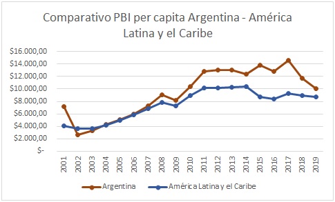 El siguiente cuadro está tomado de los datos del Banco Mundial para el período 2001-2019. Allí, luego de la crisis del 2001, se observa una fuerte tendencia alcista que en 2007 llega a niveles similares previo a la salida de la convertibilidad. Esta tendencia se desacelera en 2012, a lo que le sigue una caída en 2014 (atribuible en parte a la devaluación) y una recuperación y superación el año siguiente.