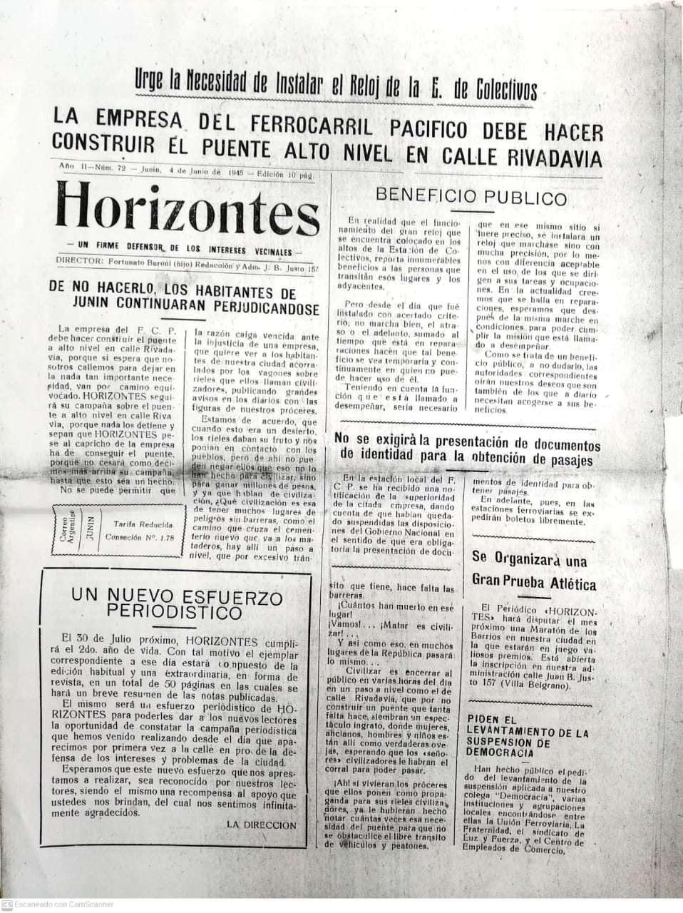 Así se expresaba en un editorial Fortunato Buroni, director de "Horizontes" una publicación juninense del 4 de junio de 1945, con el título: "La empresa del ferrocarril Pacífico debe hacer construir el puente alto nivel de calle Rivadavia".