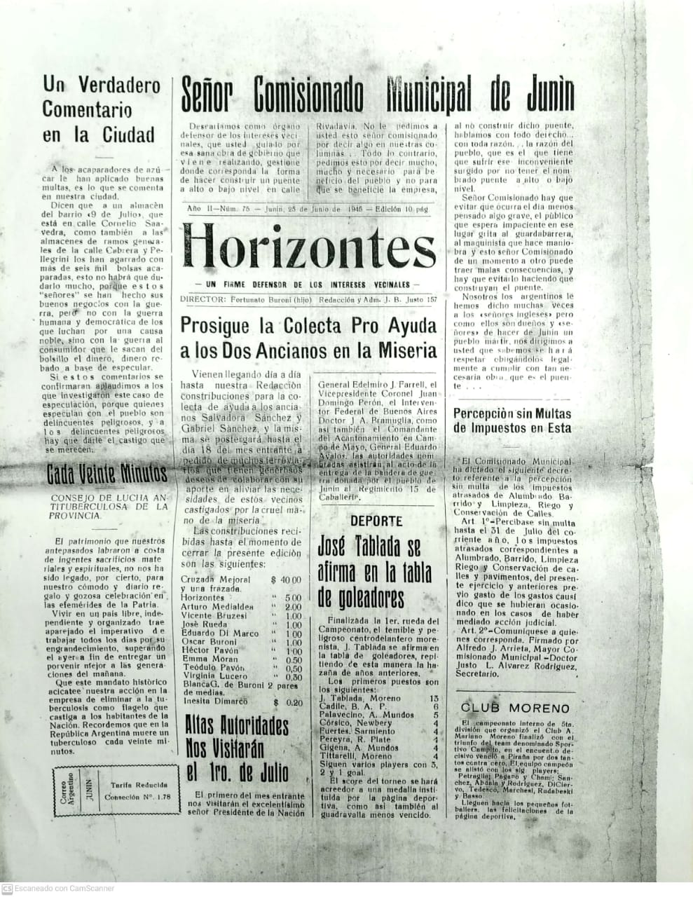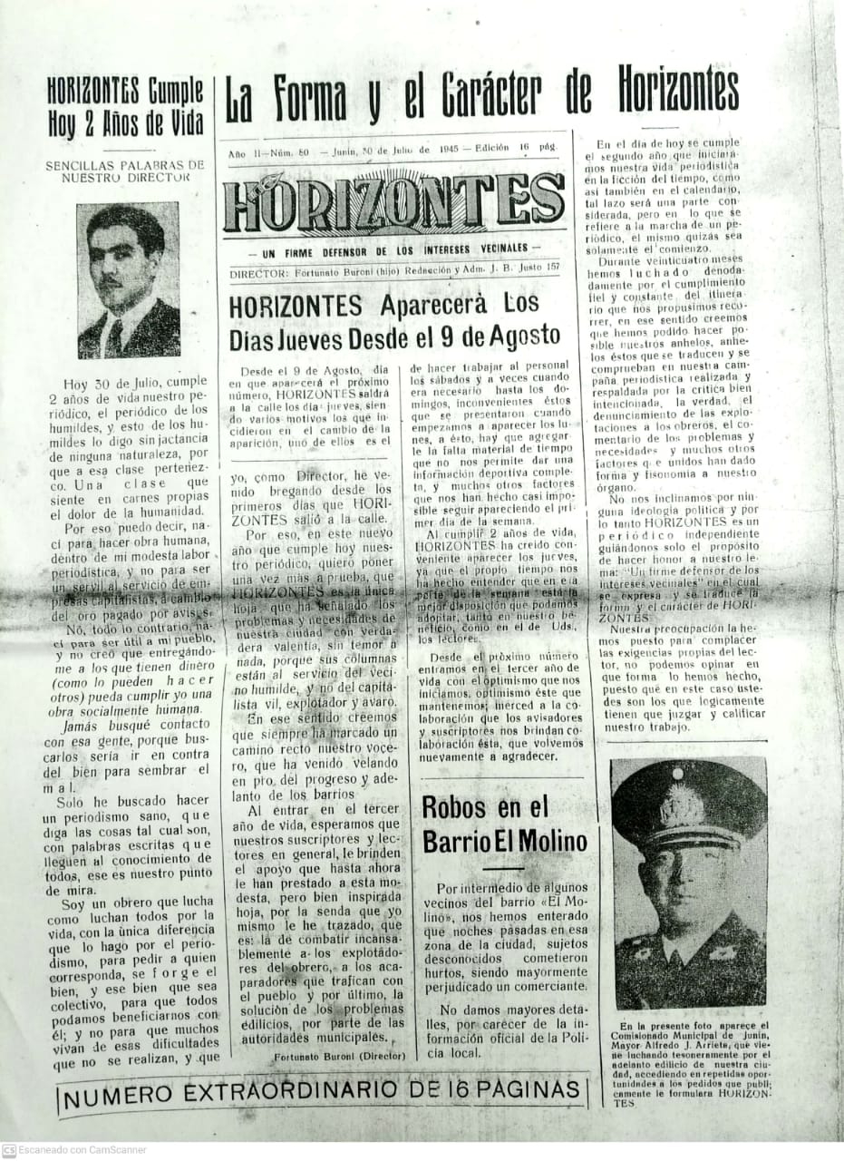 Fortunato Buroni, director de "Horizontes" -afiliado al Partido Socialista Democrático de la República Argentina y al Centro Socialista Democrático "Juan B. Justo" de nuestra ciudad- señalaba en aquel 1945: "Solo he buscado hacer un periodismo sano que diga las cosas tal cual son, con palabras escritas que lleguen al conocimiento de todos, ese es nuestro punto de mira".