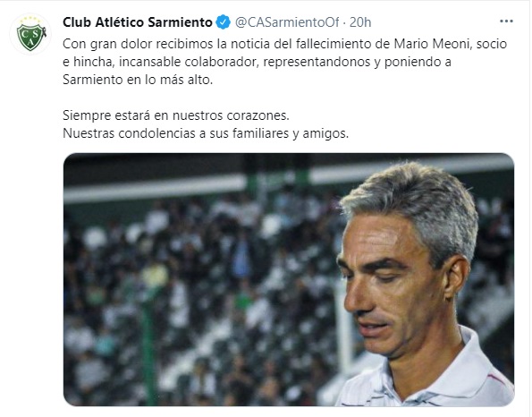 "Con gran dolor recibimos la noticia del fallecimiento de Mario Meoni, socio e hincha, incansable colaborador, representándonos y poniendo a Sarmiento en lo más alto", escribió Sarmiento de Junín en su cuenta de Twitter oficial.