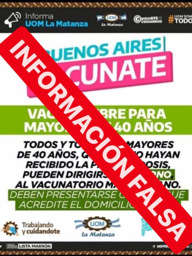 En las últimas horas había circulado una información falsa que fue reenviada por whatssap que indicaba que mayores de 40 años de edad podían vacunarse en forma libre, sin turno y que debían presentarse con DNI que acreditara el domicilio en provincia de Buenos Aires.