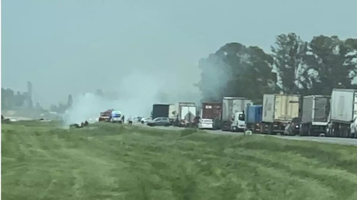 Ruta cortada, se trabaja en el lugar, el auto colisionó de frente contra el camión y posteriormente se comenzó a prender fuego.