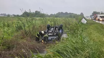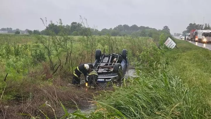 Allí, por razones que se tratan de establecer, seguramente por la acumulación de agua en la calzada, el conductor de una camioneta Dodge RAM perdió el control de la misma y terminó volcando sobre la banquina.