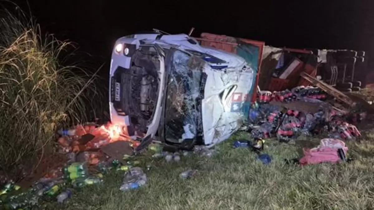Al intentar volver al asfalto se produjo el vuelco que dejó la cabina totalmente dañada y chasis y acoplado volcados sobre uno de los laterales, el chasis quedó «mirando» hacia la ruta y el acoplado hacia el alambrado, en ambos casos con la carga desparramada por completo. El chasis transportaba gaseosas y el acoplado alimento para mascotas.