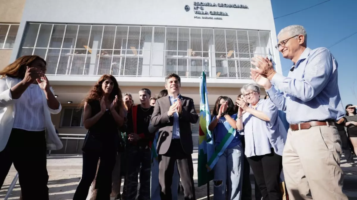 El gobernador de la provincia de Buenos Aires, Axel Kicillof, encabezó este viernes la inauguración del nuevo edificio de la Escuela Secundaria N°5 en el municipio de Villa Gesell, junto a la directora general de Cultura y Educación, Flavia Terigi; y el intendente local, Gustavo Barrera.