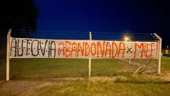 En las últimas horas, aparecieron pasacalles con críticas al presidente Javier Milei sobre la Ruta Nacional 7, a la altura de Chacabuco, en reclamo por el abandono de la obra de la Autovía.